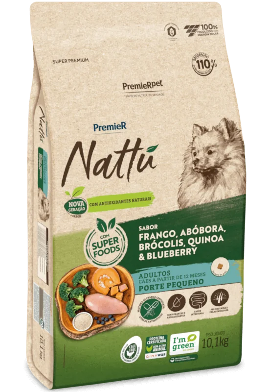 Pensada para proporcionar uma alimentação cada vez mais saudável para seu melhor amigo, a linha PremieR® Nattu possui ingredientes selecionados, nutritivos e satisfação comprovada. Com uma fórmula sem corantes e aromatizantes, PremieR® Nattu Abóbora é recomendado para a alimentação de cães adultos de pequeno porte e traz em sua base de ingredientes Frango, Abóbora, Brócolis, Quinoa e Blueberry, itens de alta densidade nutricional, que oferecem muitos nutrientes e poucas calorias, proporcionando uma dieta mais equilibrada para seu cão. Uma exclusividade deste alimento são os ovos utilizados na formulação, provenientes do sistema de criação Cage Free, no qual as aves possuem liberdade de movimento, com acesso a ninhos, permitindo assim sua total locomoção. Se você busca o alimento certo para uma dieta natural e repleta de benefícios para seu pet, não deixe conhecer todos os produtos de nossa linha Nattu.