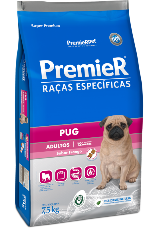 Cada raça possui suas particularidades e se beneficia de cuidados especiais. Pensando nestas necessidades a PremieRpet® criou PremieR® Raças Específicas, a primeira linha mundial de nutrição específica para raças. Este produto é indicado para cães adultos da raça Pug em manutenção. Por se tratar de um alimento completo, balanceado e rico em nutrientes, não recomendamos nenhum tipo de suplementação vitamínico-mineral. Oferece ainda redução do volume e odor de fezes minimizando possíveis inconvenientes de uma convivência tão próxima entre os cães e seus proprietários.