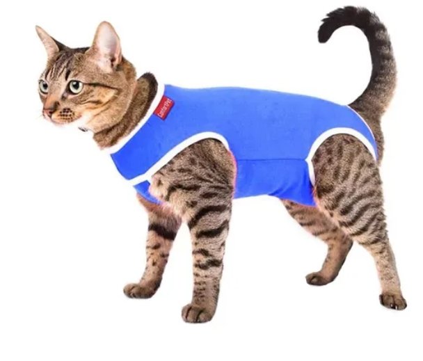 Roupa Pós Cirúrgica Para Gatos – Confort Pet Elaborada para anatomia exclusivamente dos felinos, a roupa cobre toda cadeia mamaria e é indicada para castração de fêmea e cirurgias abdominais em geral. A roupa não serve para castração de gatos machos, pois a região da cirurgia fica exposta. A cava no ombro é mais alta impedindo que o gato saia, pois o gato possui mais flexibilidade que os cães. As roupas pós-cirúrgicas são confeccionadas com 92% cotton de ótima qualidade que não retem calor e contem 8% de elastano, proporcionando melhor elasticidade e conforto para o animal, os pigmentos usados para coloração são atóxicos e elaborados de forma a manter as cores vivas e seu tempo de durabilidade é muito maior. ============================================================================ INSTRUÇÕES DE LAVAGEM Deixar de molho por aproximadamente 30 minutos em água limpa, usar sabão neutro e secar na sombra, não usar alvejantes. ============================================================================ ROUPAS PÓS CIRÚRGICAS EXCLUSIVAS PARA GATOS Indicada para mastectomia, cirurgias abdominais em geral e castração. (No caso de gato macho, fazer um corte na região).